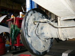 後ろからガラガラ音がする。乗っていて不安だと言うことで入庫。試乗すると確かにすごい音。車軸からオイル漏れてます。ブレーキの不良ではありません。 |